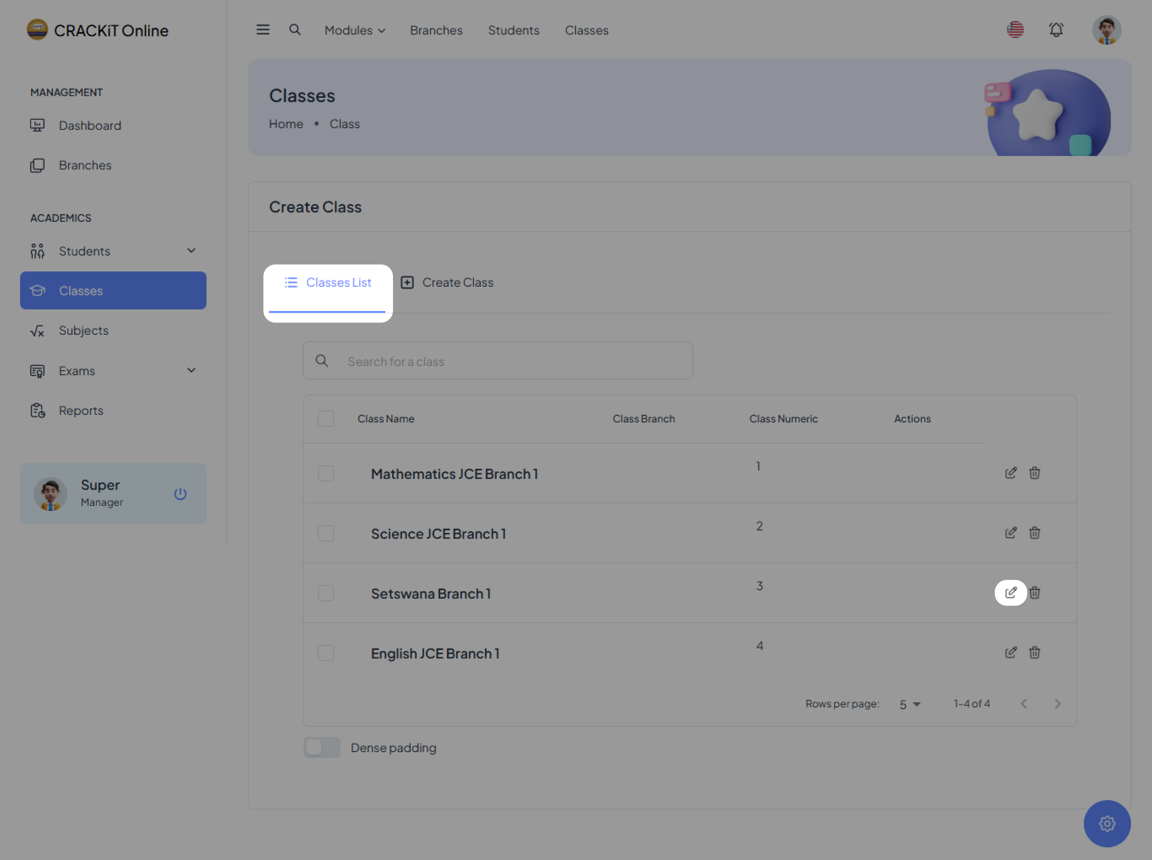 To edit a class, click on Classes List, locate the edit icon next to the class you want to modify, and click on it.