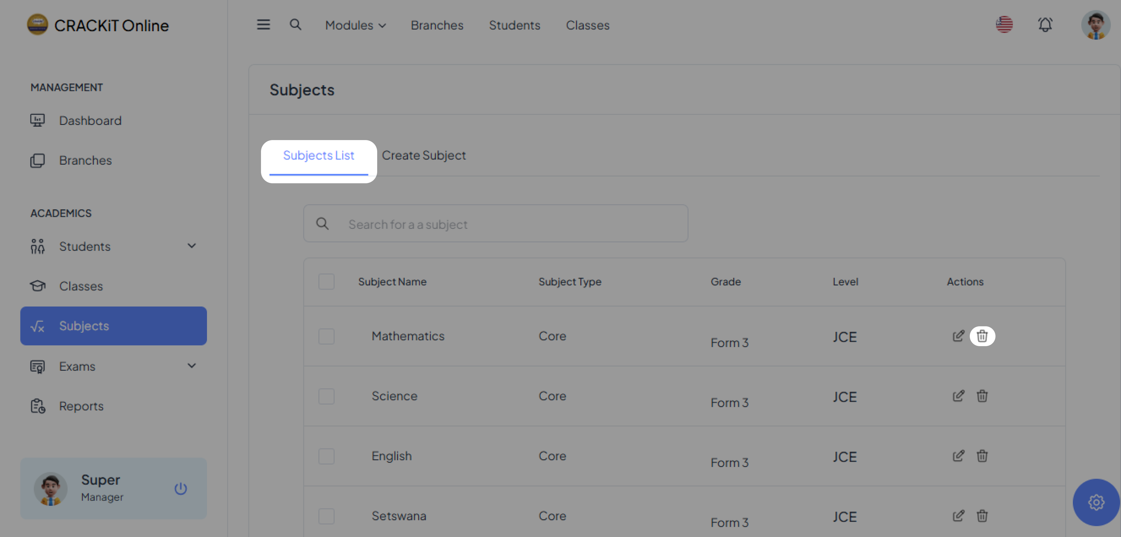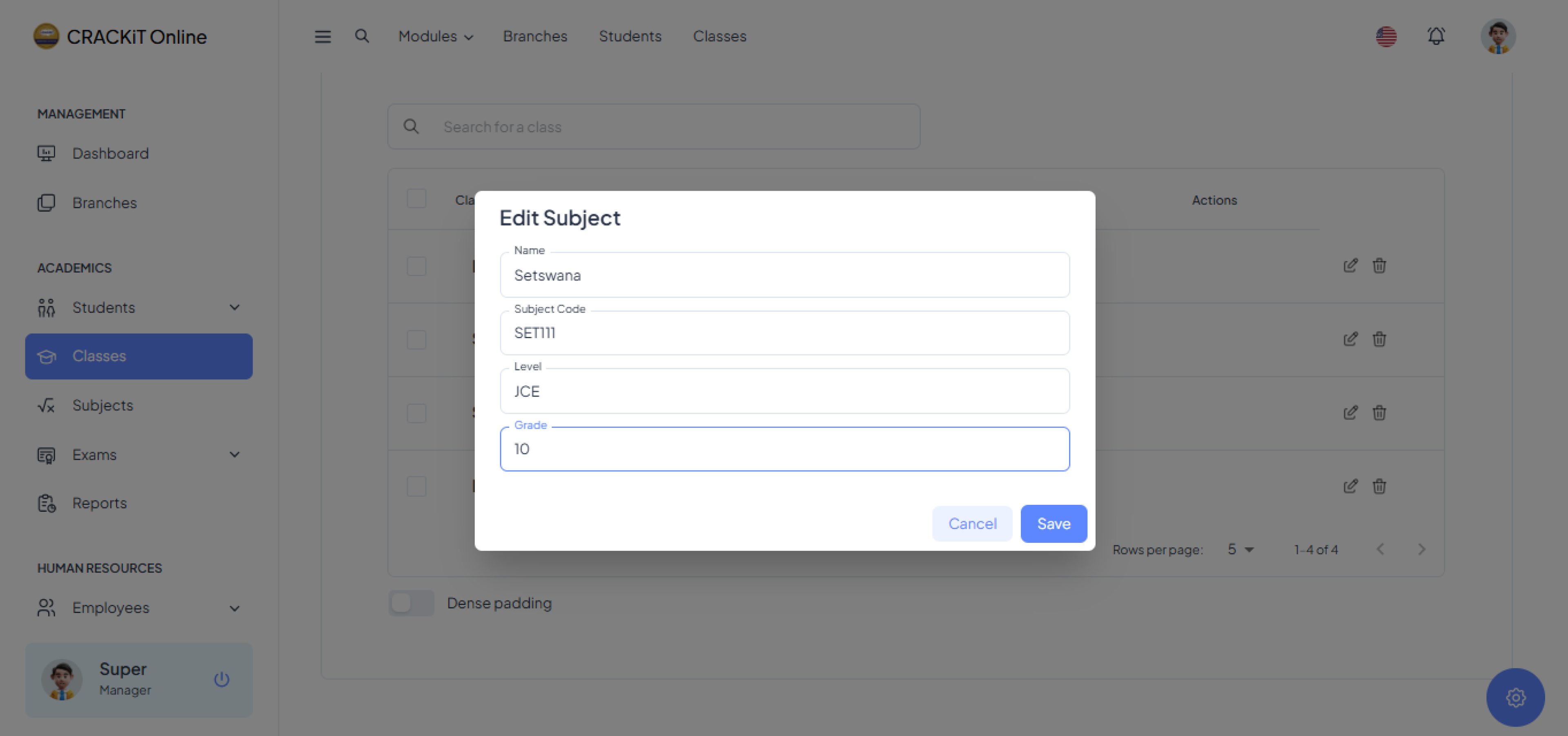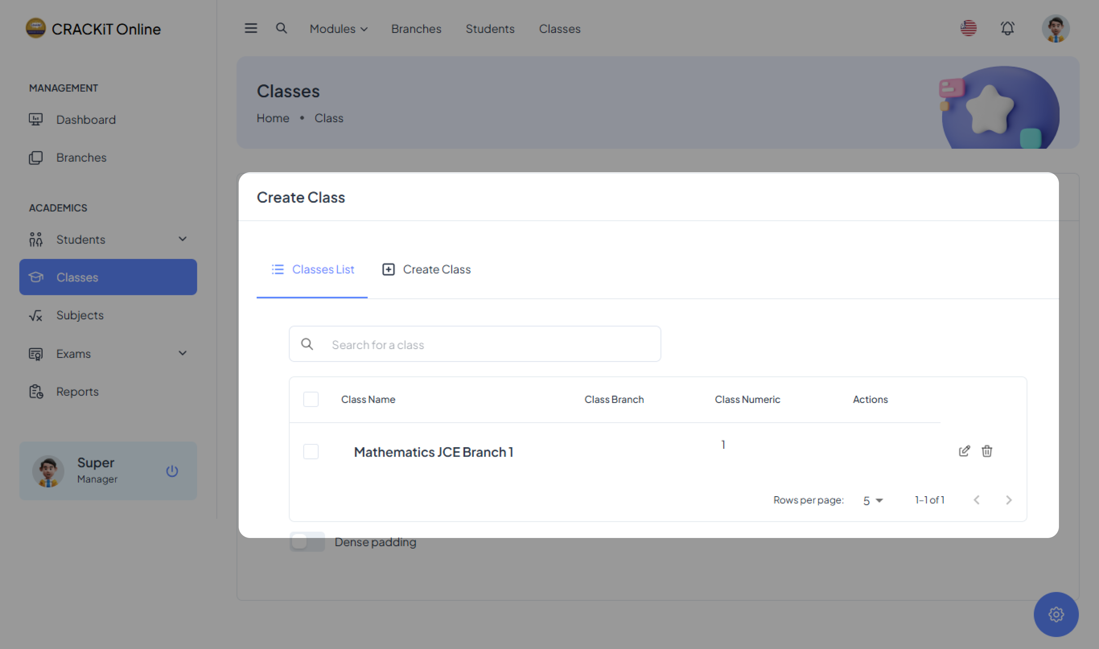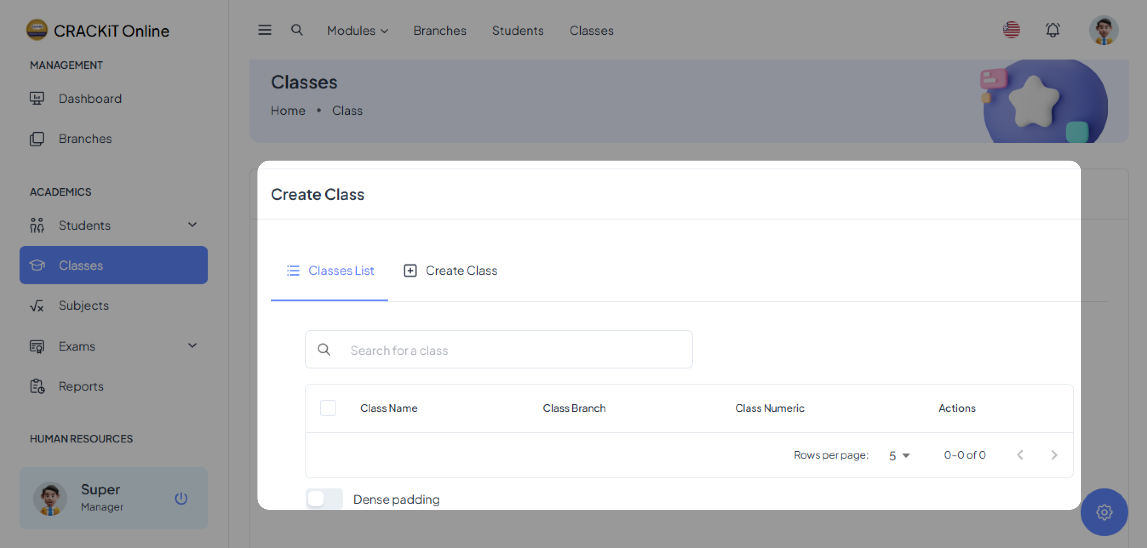 The Classes Module allows users to manage classes. Users can create a class and the class is added to the Classes List. The module also provides options to update or delete classes.