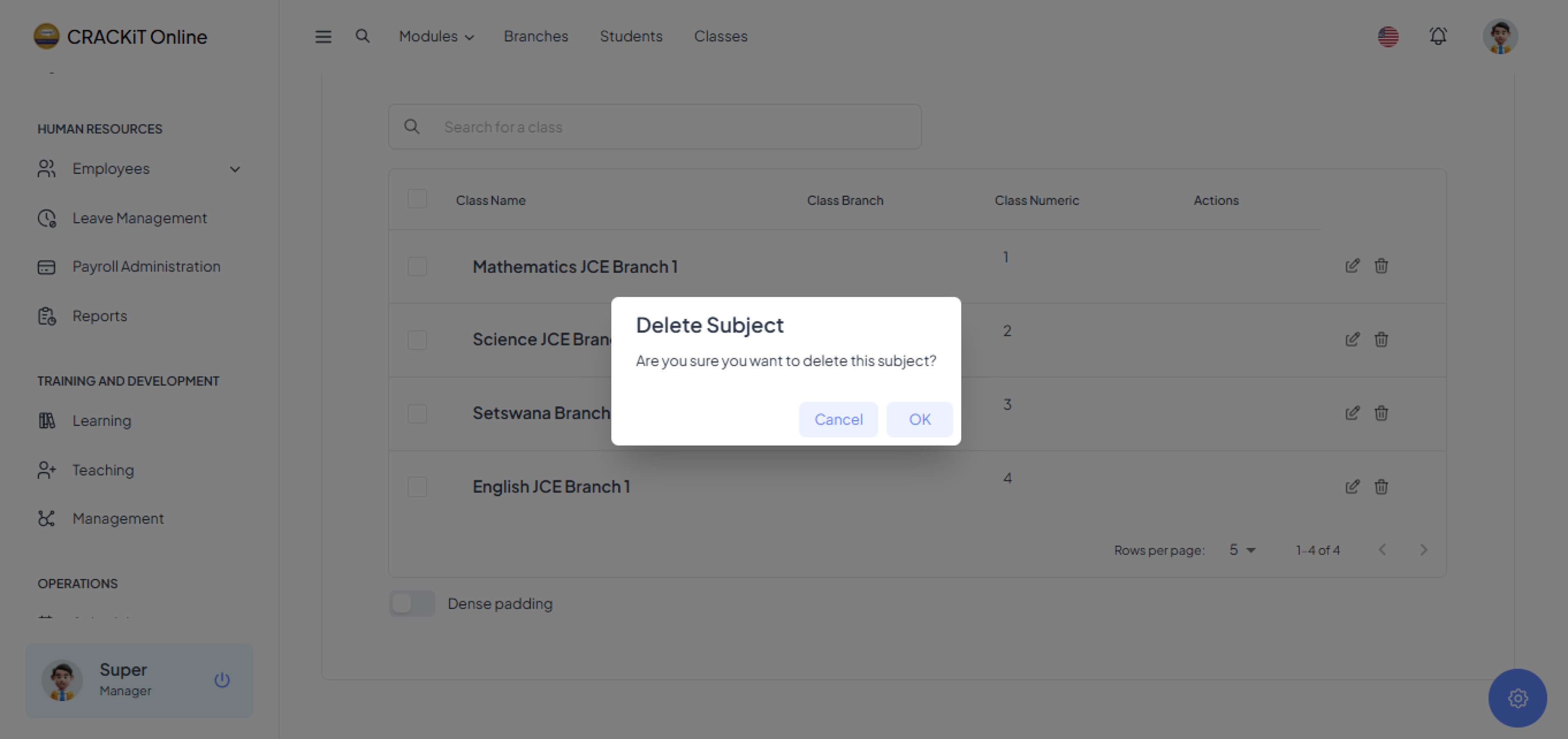 To delete a class, the user should locate the delete icon next to the class and click it. A pop-up message will appear; the user should click OK to confirm the deletion.