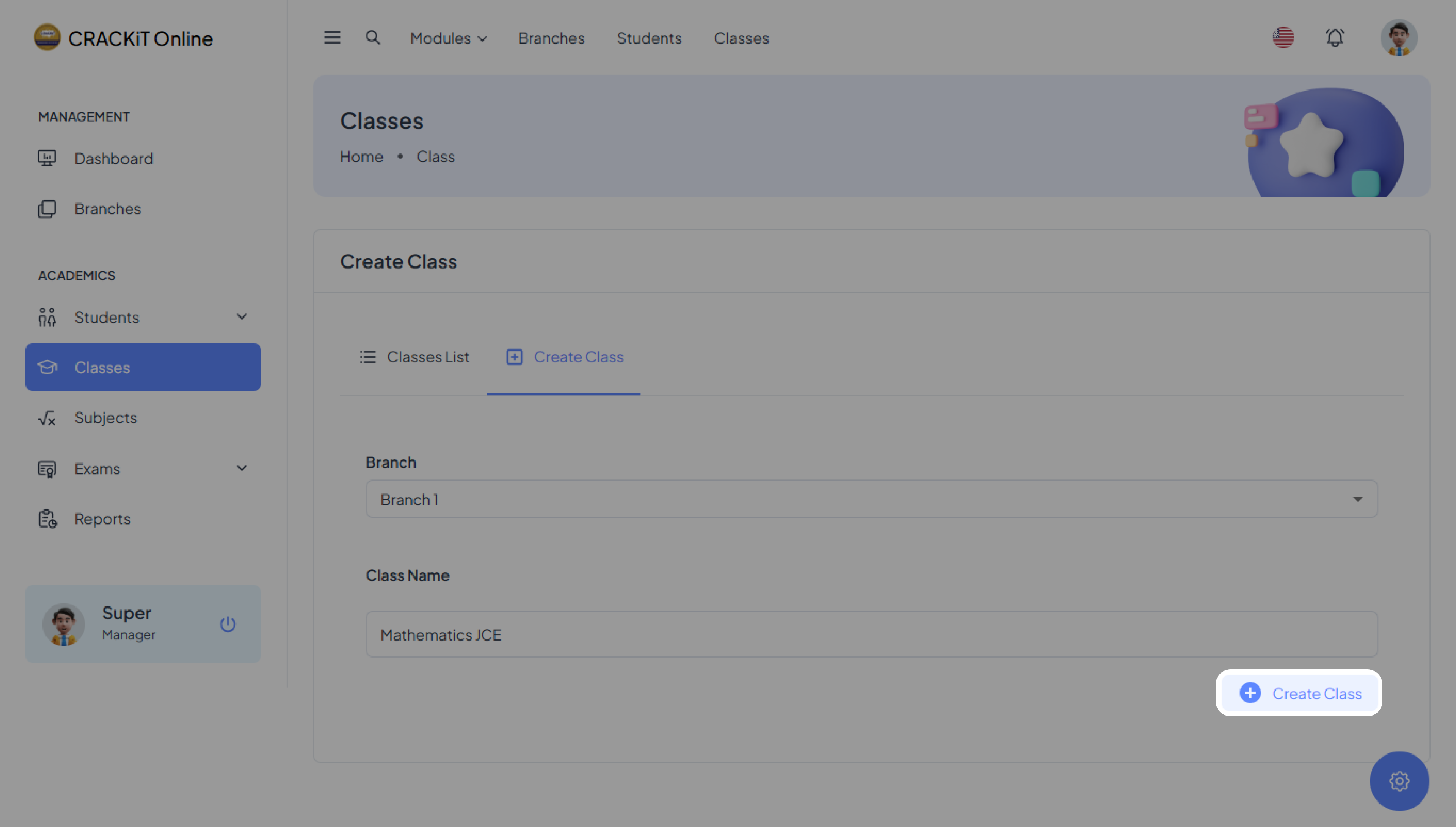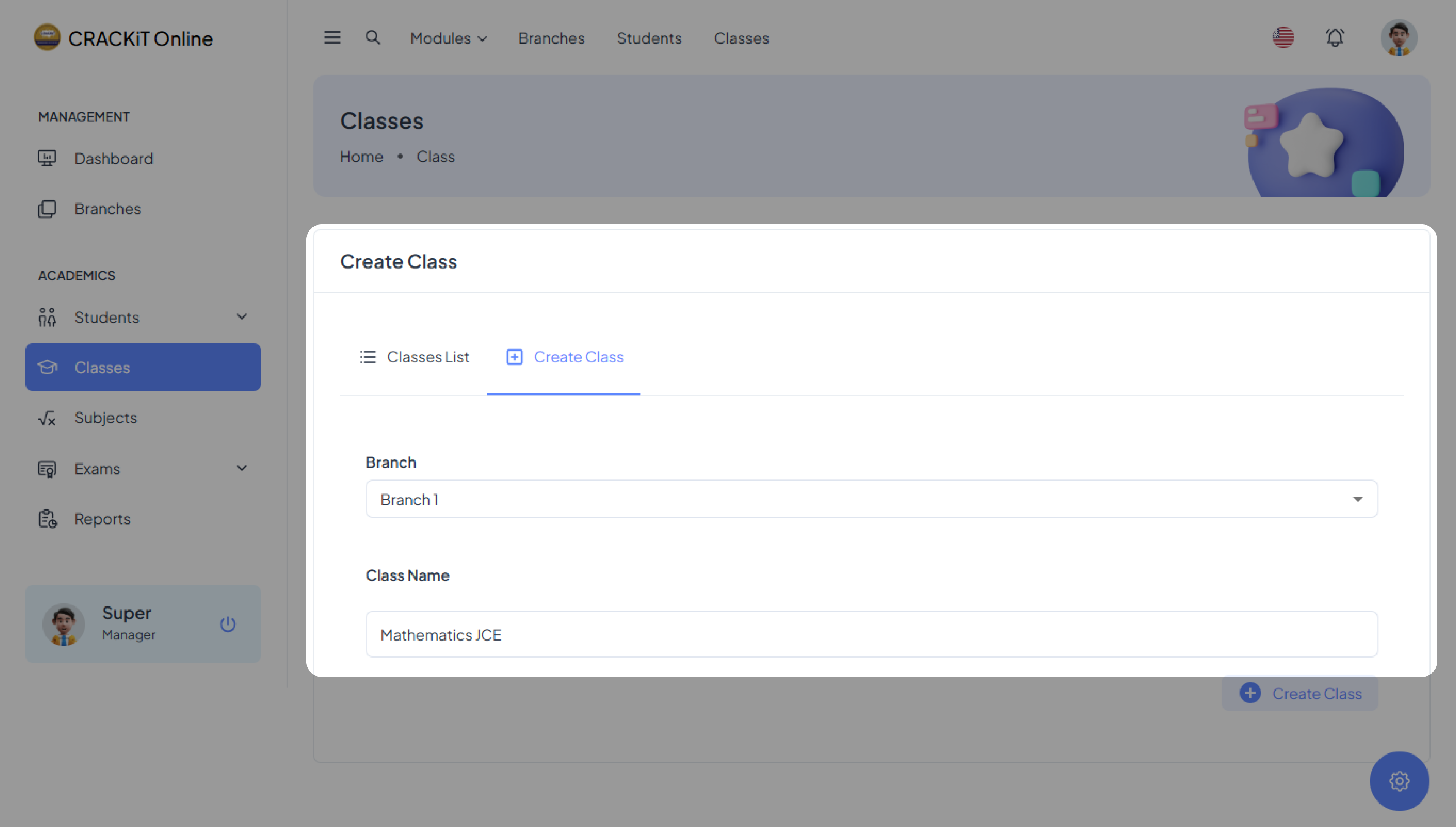 To create a class, click on Create Class and fill in the branch to which the class belongs and the name of the class.