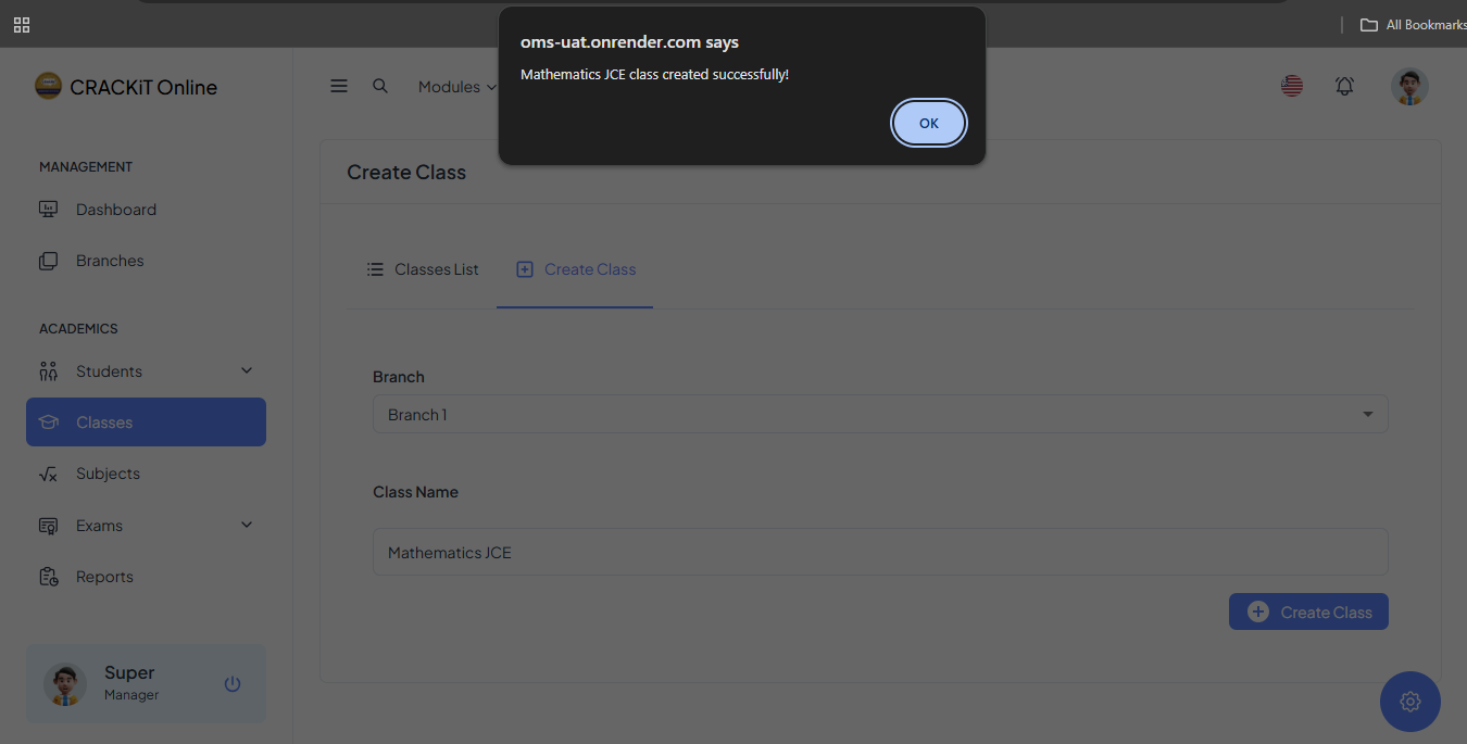 After completing the form, click the Create Class button to submit, A pop-up message will confirm successful submission. Click Ok to exit.