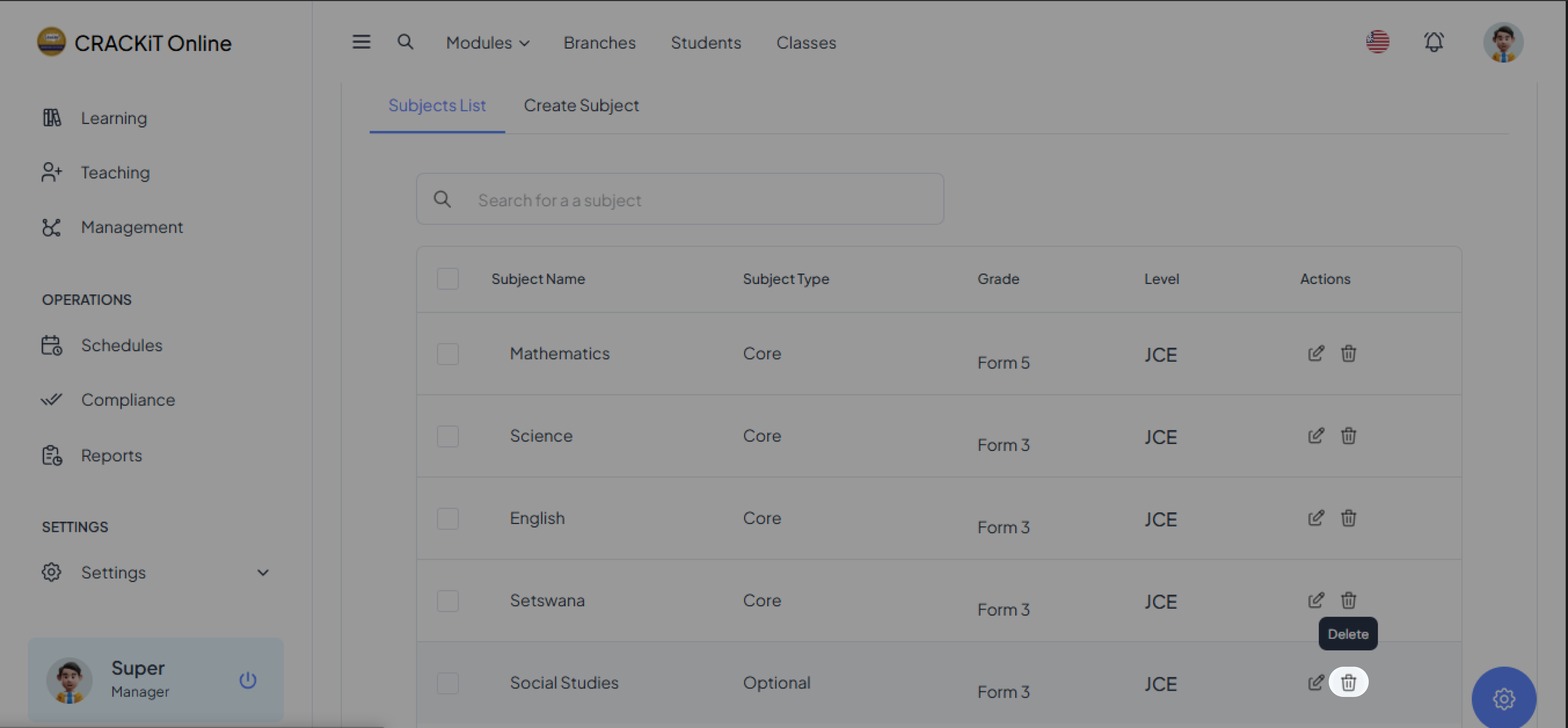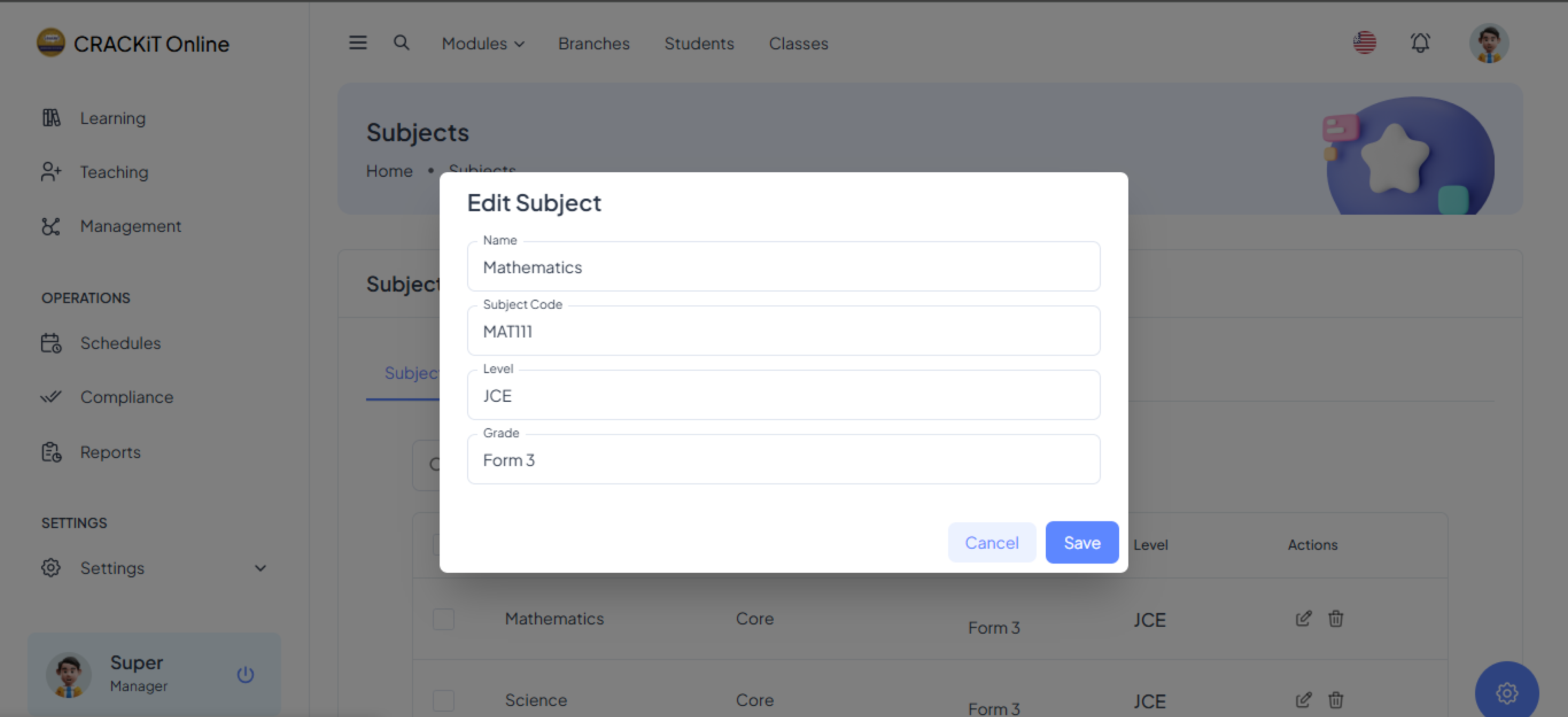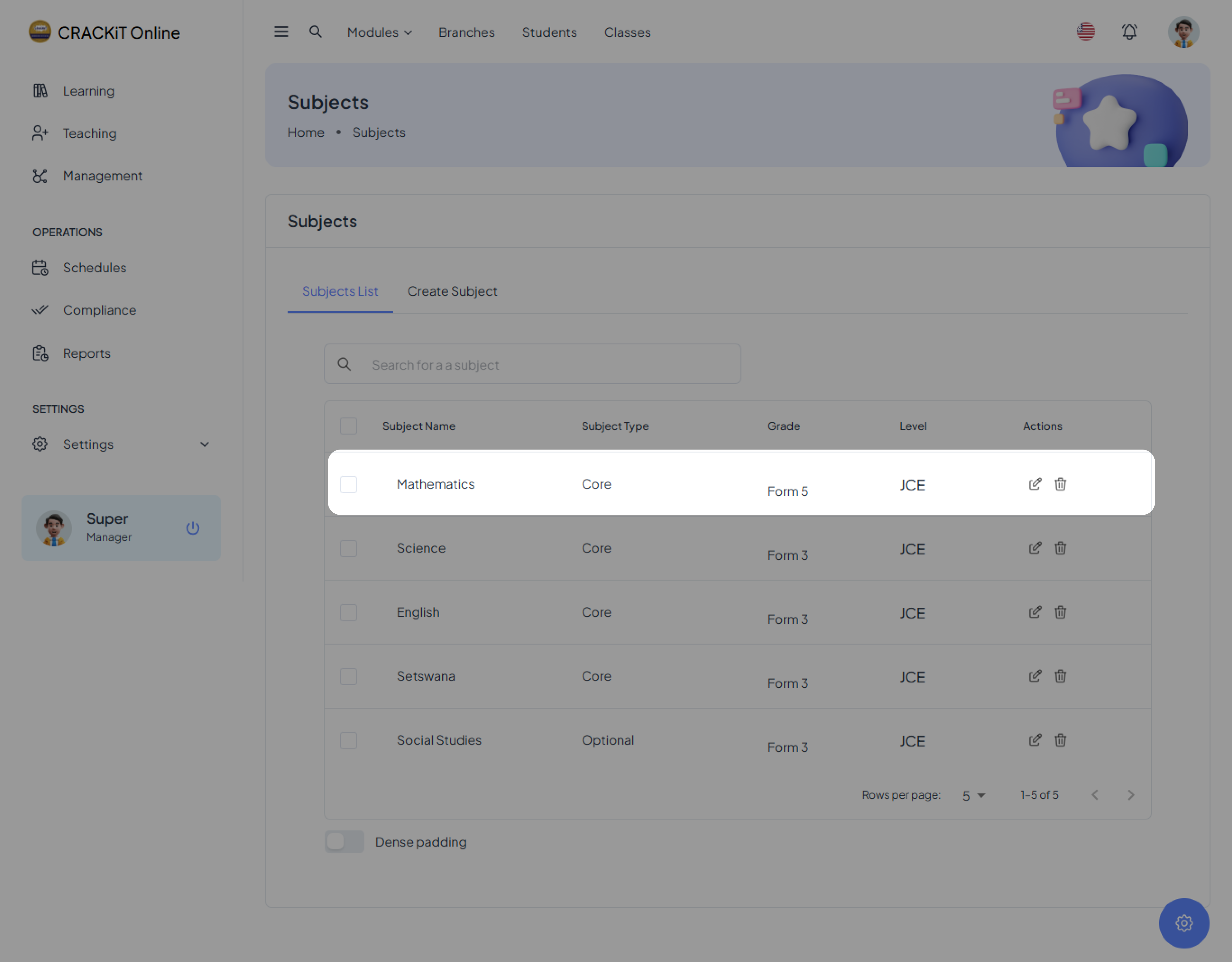 The Subject Module is designed to streamline the management of subjects, enabling users to create, view, edit, delete, search, and sort subjects efficiently.