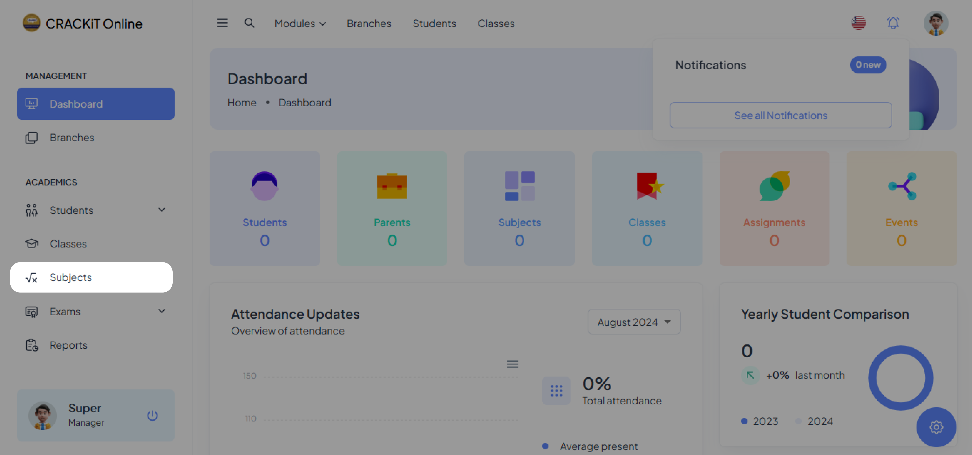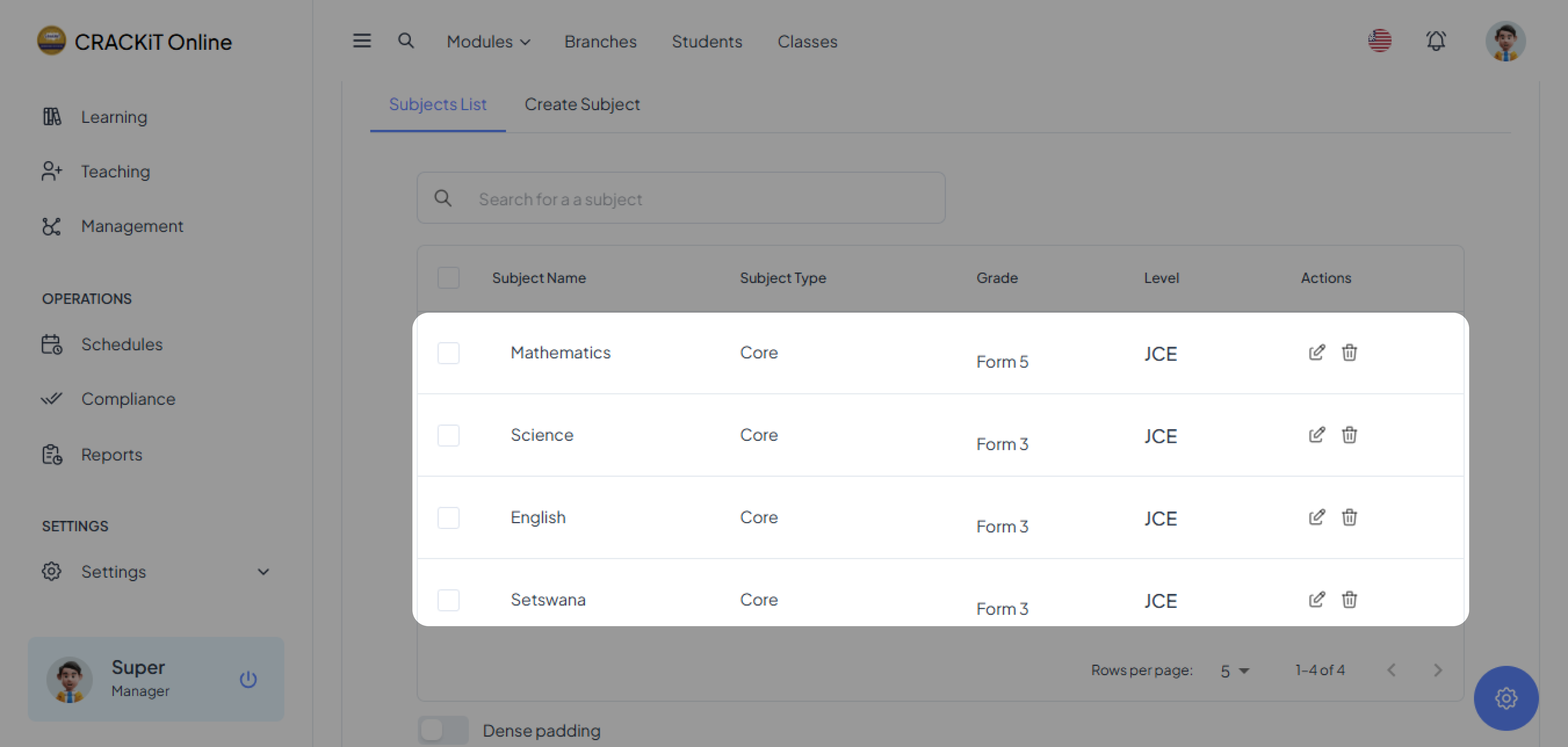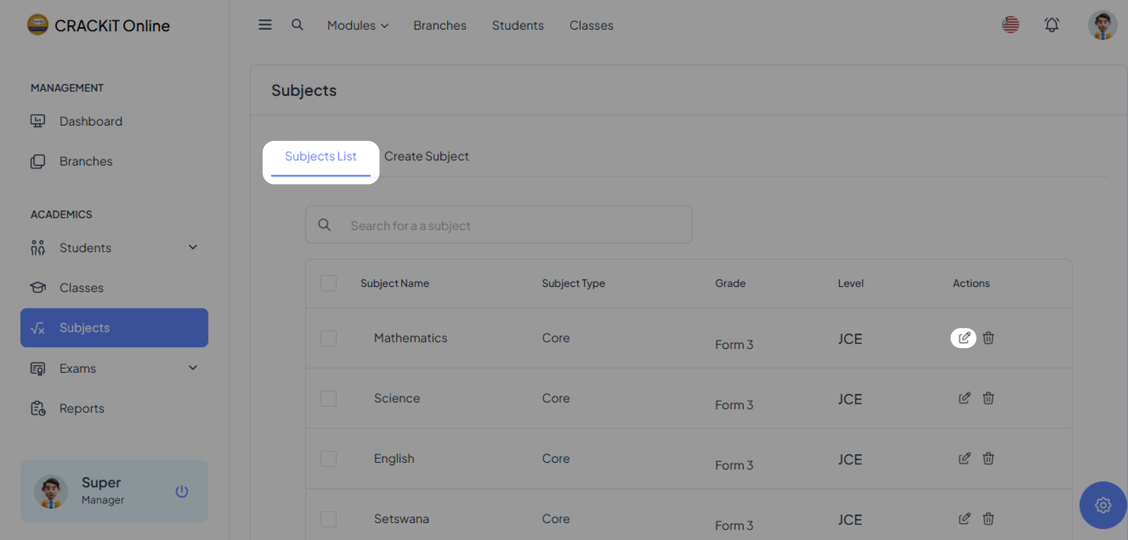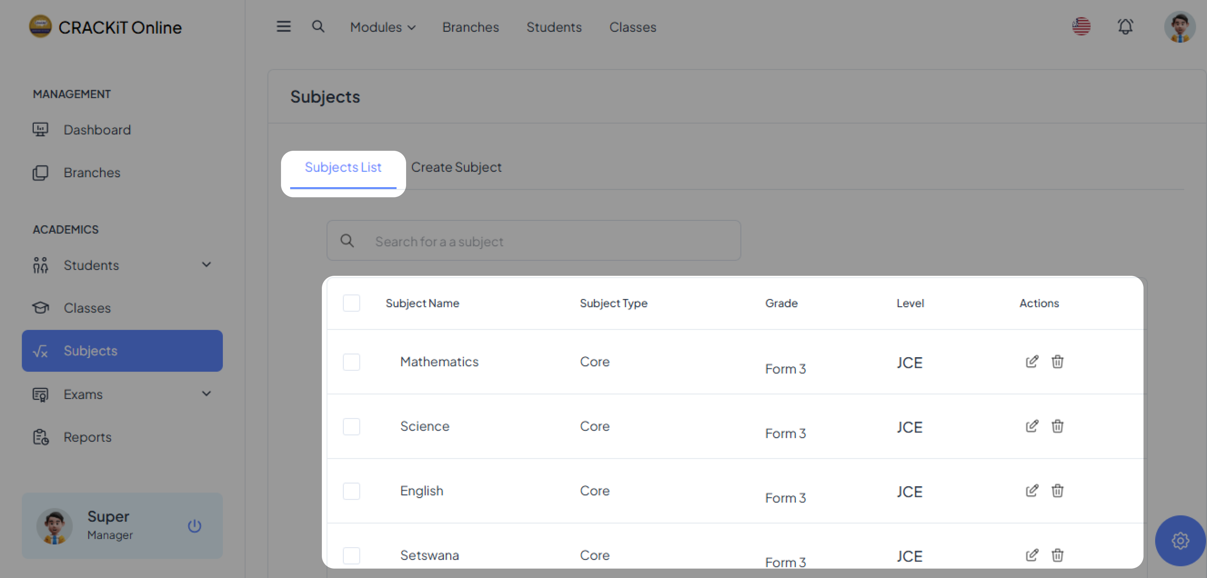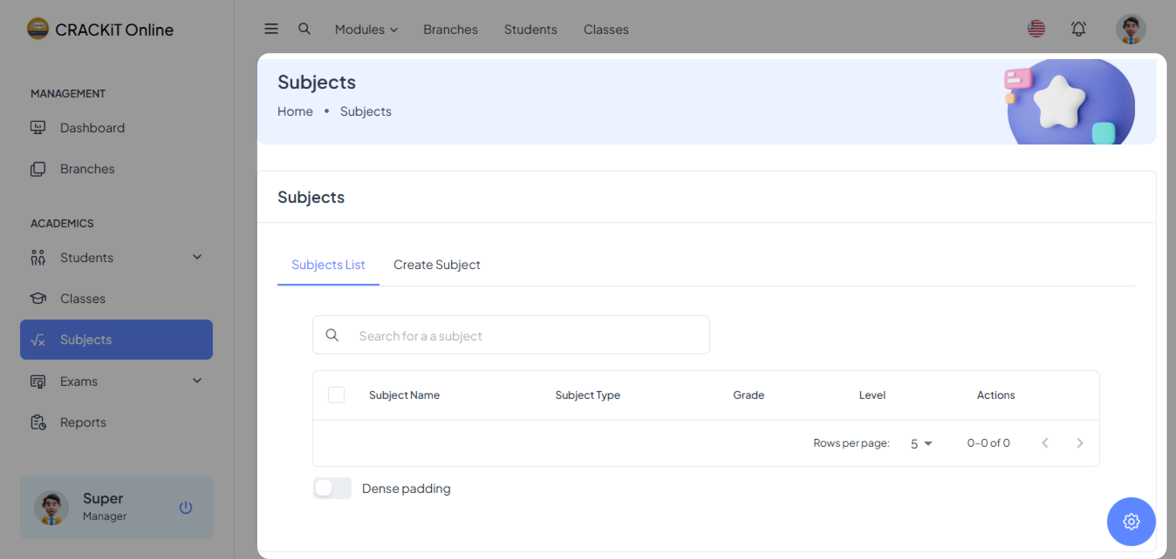 To access the Subjects Module, the user must click on Subjects in the side navigation menu. This action opens the Subjects page, as shown below.