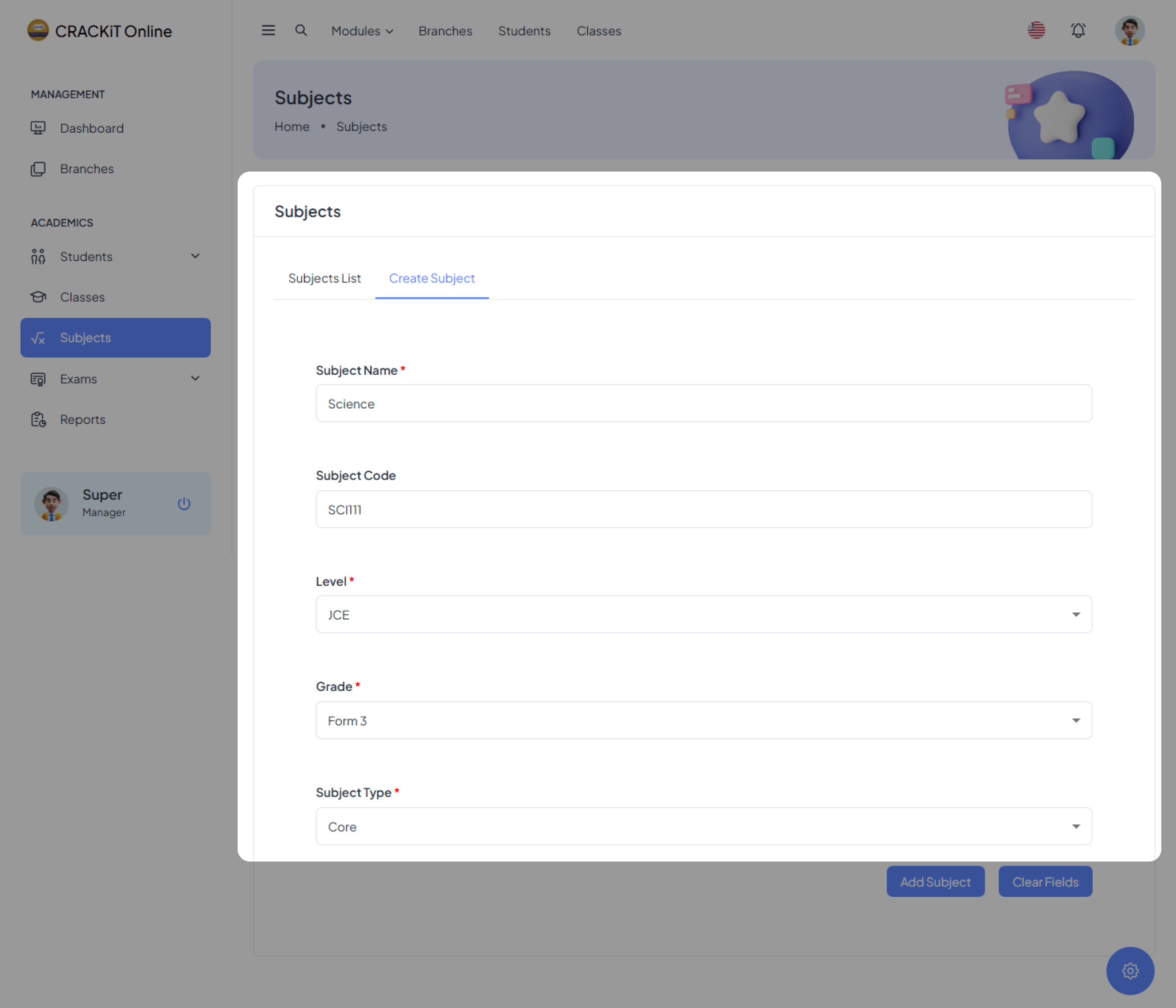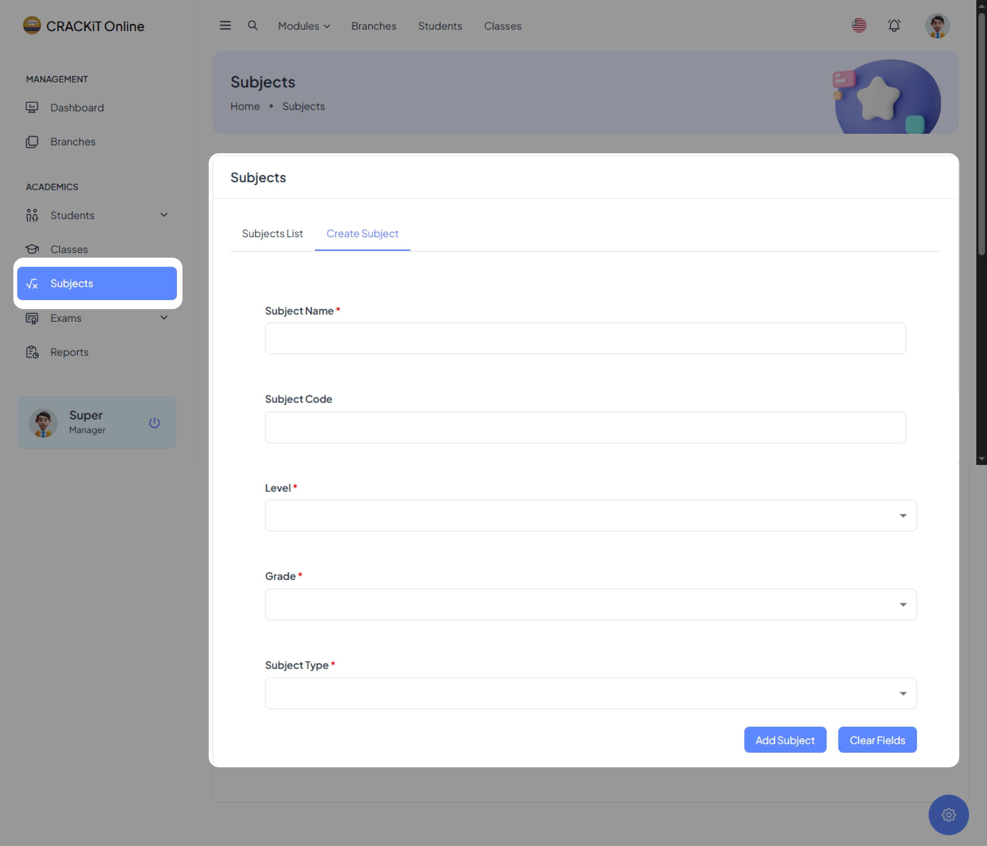 To create a new subject, the user should click on Create Subject and fill in the required information in the provided form.