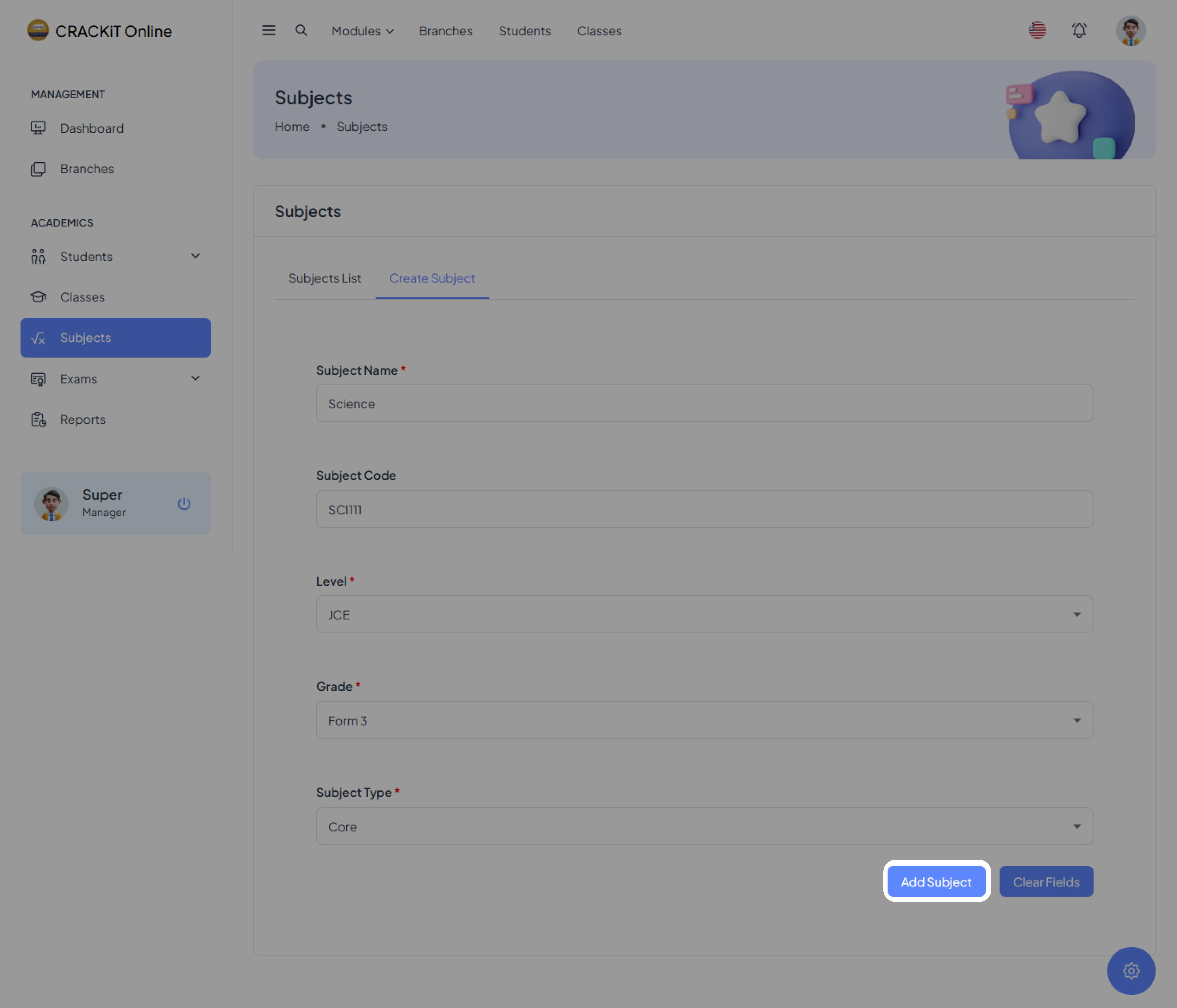 Once all necessary details are entered, the user must click the Add Subject button to submit the form.