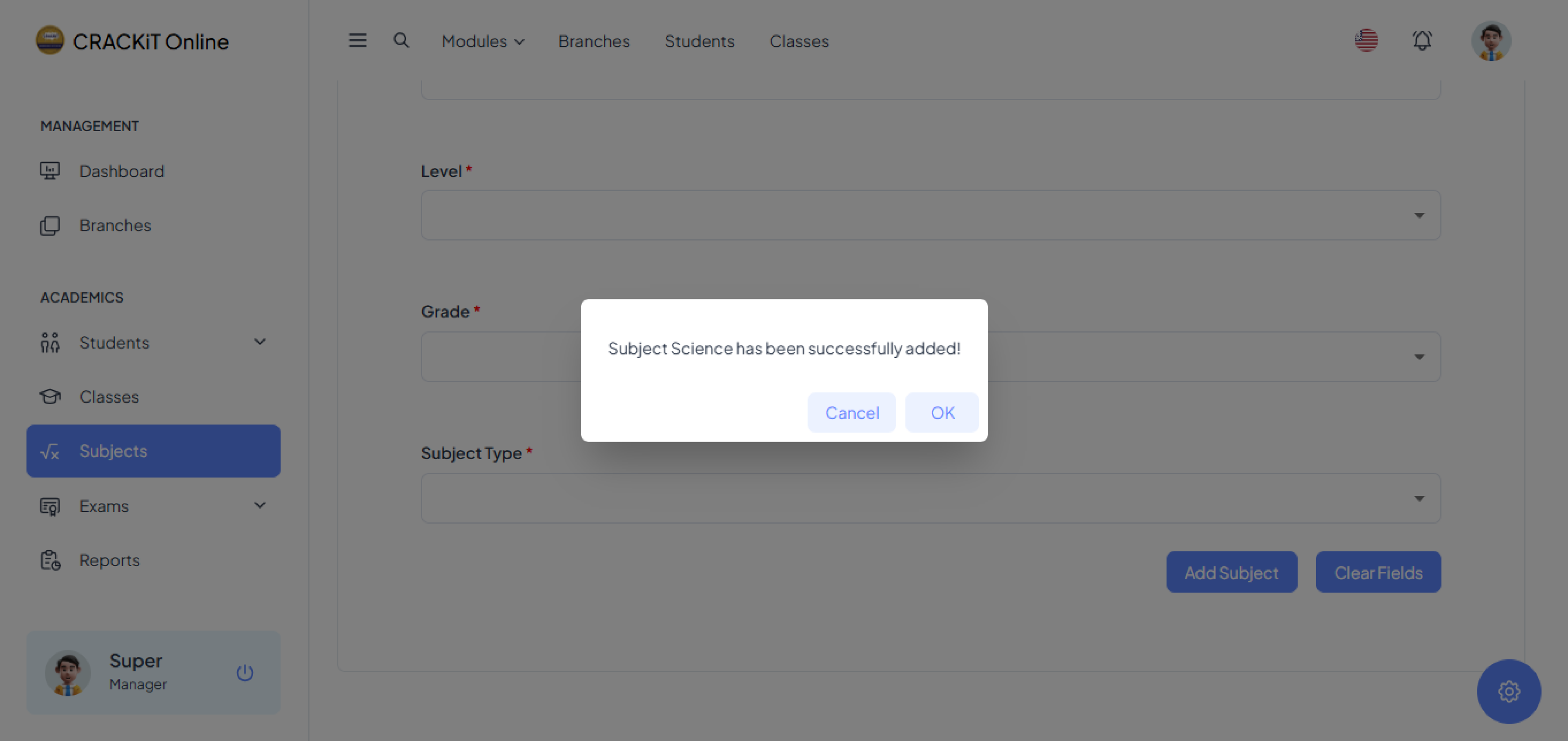 After successfully adding a subject, a pop-up message will appear. The user needs to click the OK button to close the message.