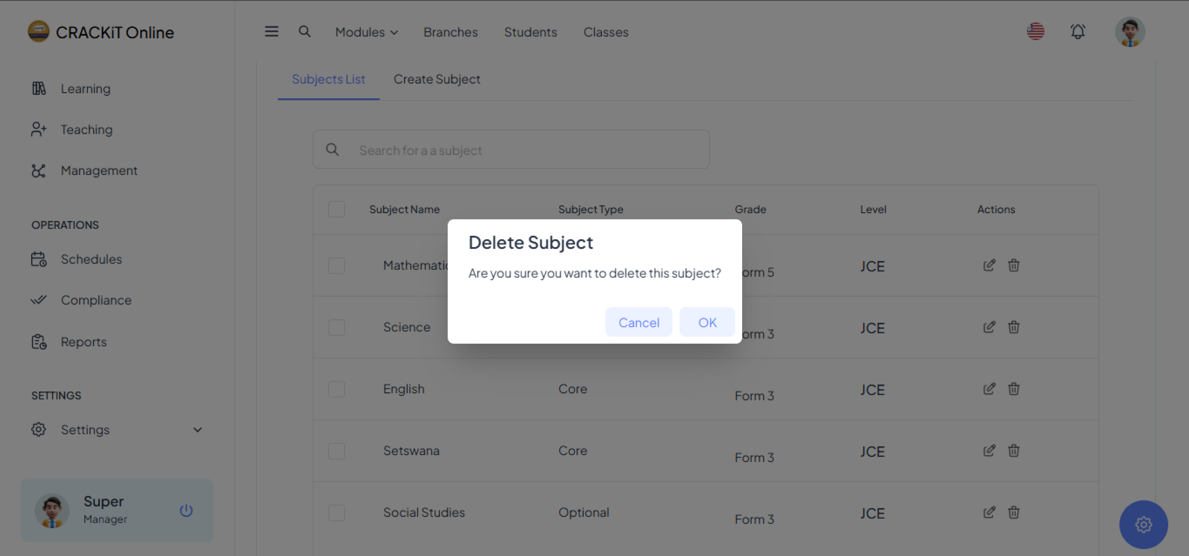 The user will then need to confirm the deletion by clicking the OK button in the confirmation dialog. A pop-up message will appear to indicate the successful deletion of the subject. The user must click OK to close the message.